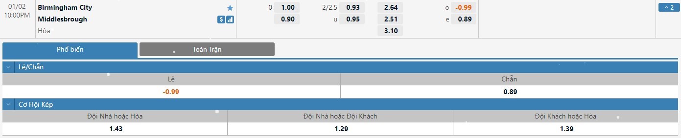 Tỉ lệ kèo bóng đá trực tuyến trận đấu Birmingham vs Middlesbrough
