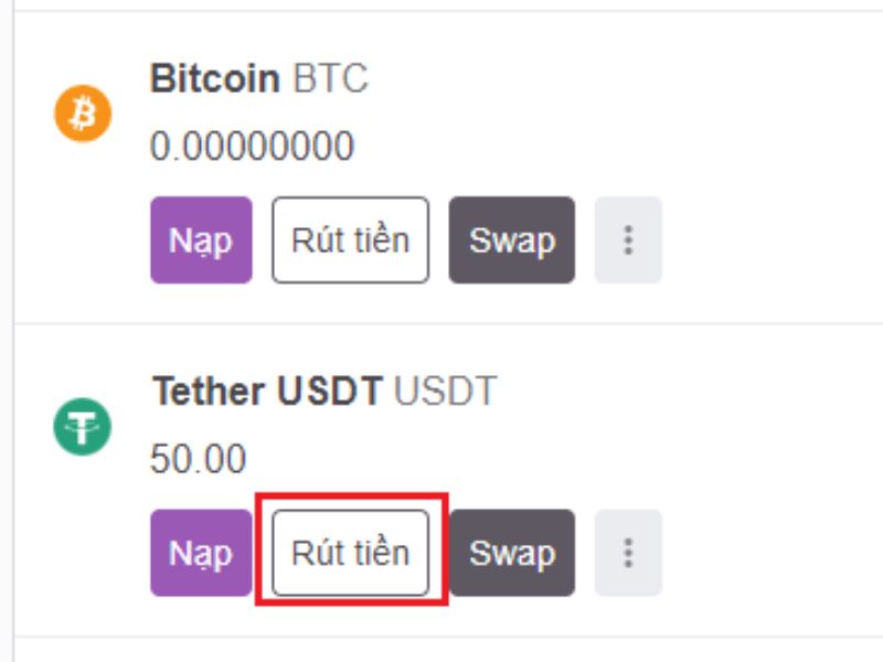 Nhấp vào nút "Rút tiền" trong mục USDT.