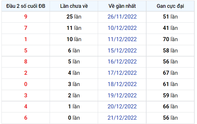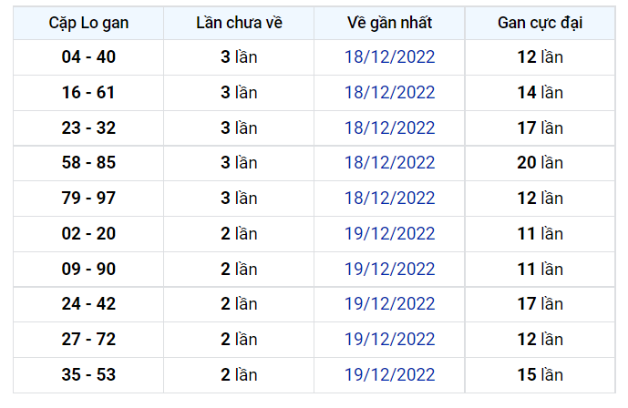 Các cặp số lô gan Miền Bắc tính đến ngày 22/12/2022