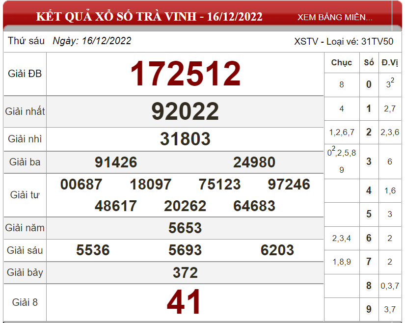 Kết quả xổ số Trà Vinh ngày 16/12/2022
