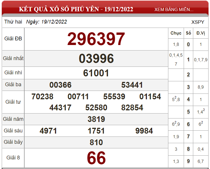 Kết quả xổ số Phú Yên ngày 19/12/2022